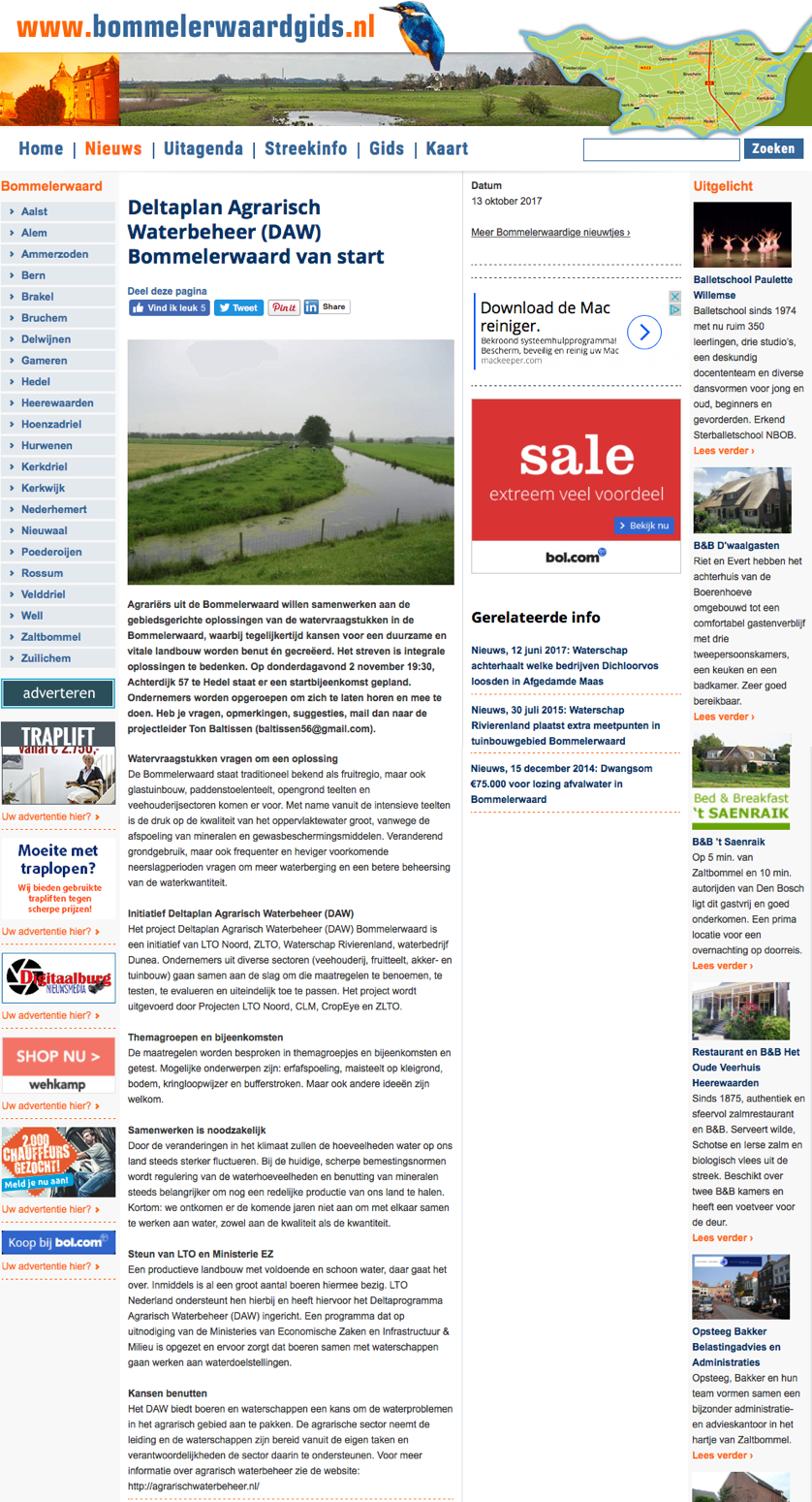Het project Deltaplan Agrarisch Waterbeheer (DAW) Bommelerwaard wordt uitgevoerd door Projecten LTO Noord, CropEye, CLM en ZLTO en is een initiatief van LTO Noord, ZLTO, Waterschap Rivierenland, waterbedrijf Dunea.